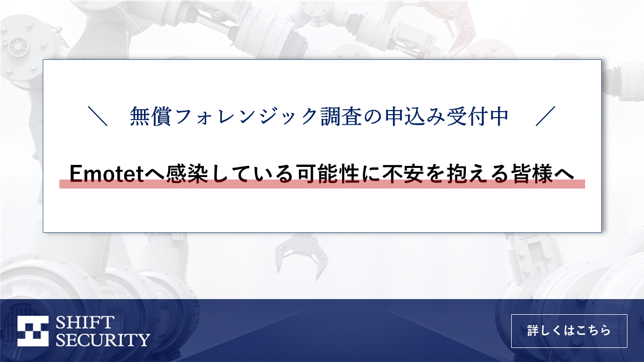 SHIFT SECURITYは、「笑顔をつくる」という理念のもと、セキュリティの専門会社として「コストがかかるためセキュリティ対策に取り組めない企業も救うことは社会的役割の一つである」と定め、この度、感染拡大しているEmotetへのセキュリティ対策において、コストの問題や人員不足、専門知識の不足でセキュリティ対策ができないことによる被害拡大を防ぐべく、フォレンジック調査の無償提供を開始しました。