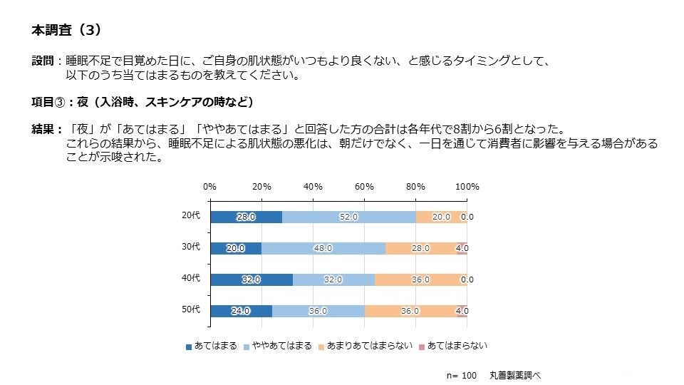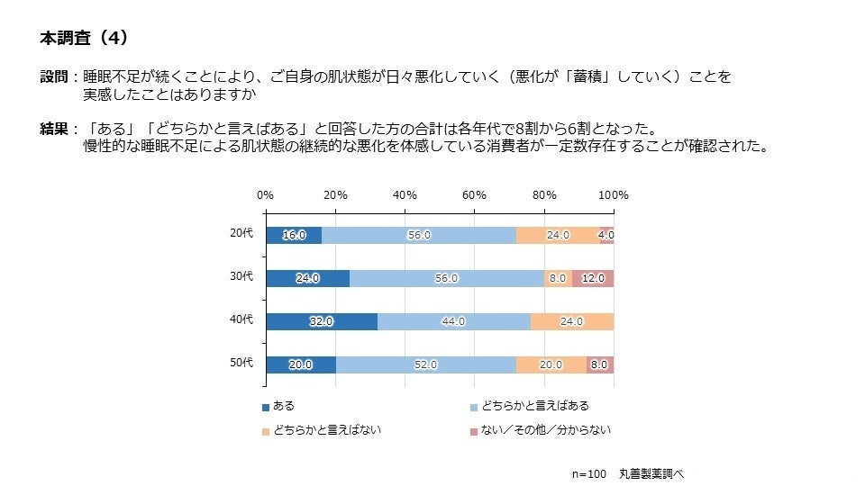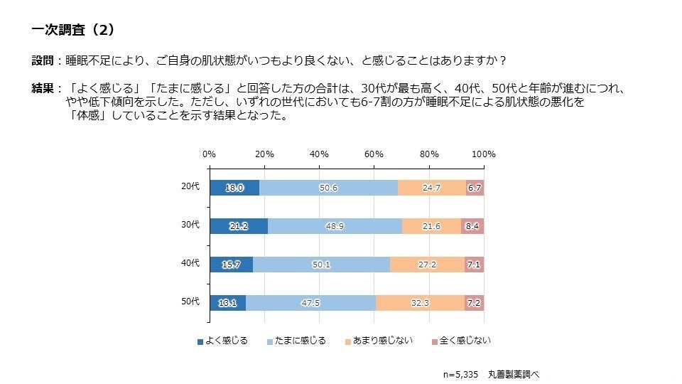 この調査により、いずれの世代においても8割弱の方が自身を「睡眠不足」であると感じており、また、6割から7割の方が「睡眠不足による肌状態の悪化」を体感していることが確認されました。