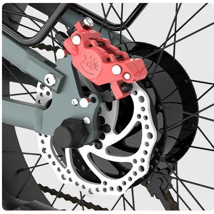 前輪、後輪ともに車やバイクに使われる油圧ディスクブレーキ(KW20-Sは機械式)を採用。ブレーキパッドがディスクを噛む面積が大きく、軽い力で大きな制動力が働き、急な下り坂や雨天でもしっかり減速できます。