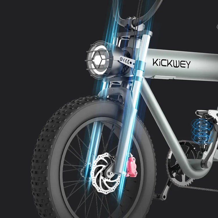 マウンテンバイクと同様に前後のタイヤにフルサスペンションを搭載。フロントフォークには油圧サスペンションを内蔵(KW20-G)し、ともに地面からの衝撃を緩和し、段差やでこぼこ道でも快適なライディングが楽しめます。
