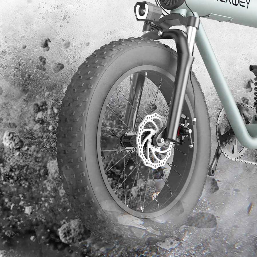 タイヤはタイヤ径20インチ、幅4インチのファットタイヤでクッション性と安定性があり、段差の乗り越えや泥や雪、砂利などの悪路でもそのまま走れます。