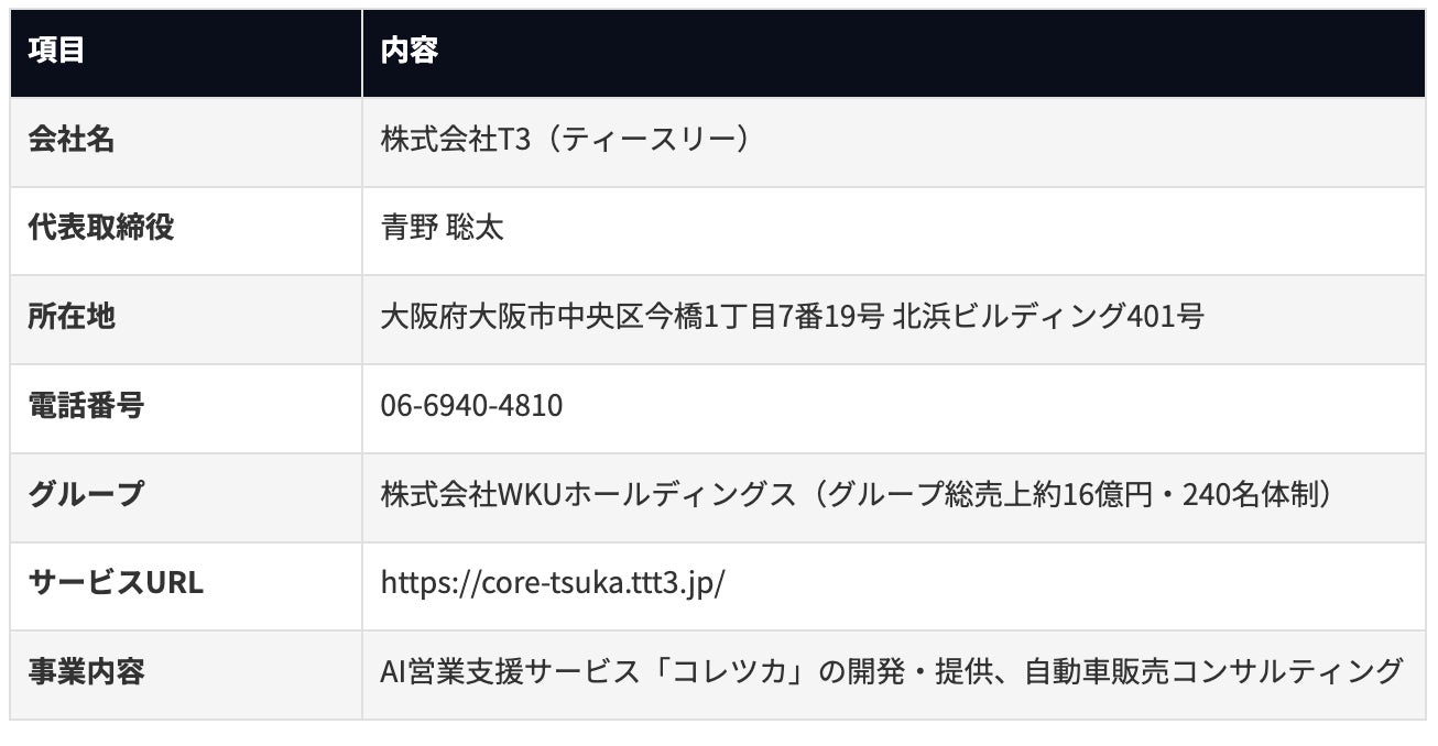 株式会社T3(本社:大阪府大阪市、代表取締役:青野聡太、以下「T3」、https://core-tsuka.ttt3.jp/ )は、自動車販売業界に特化したAI営業支援SaaS『CORE-TSUKA(コレツカ)』を2026年4月1日に正式ローンチいたしました。