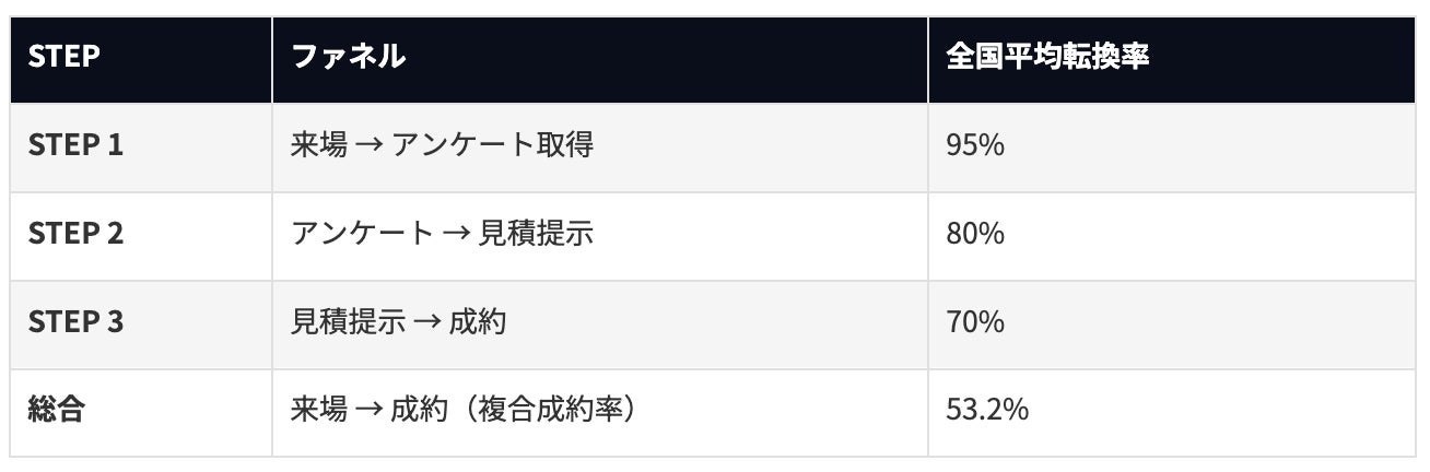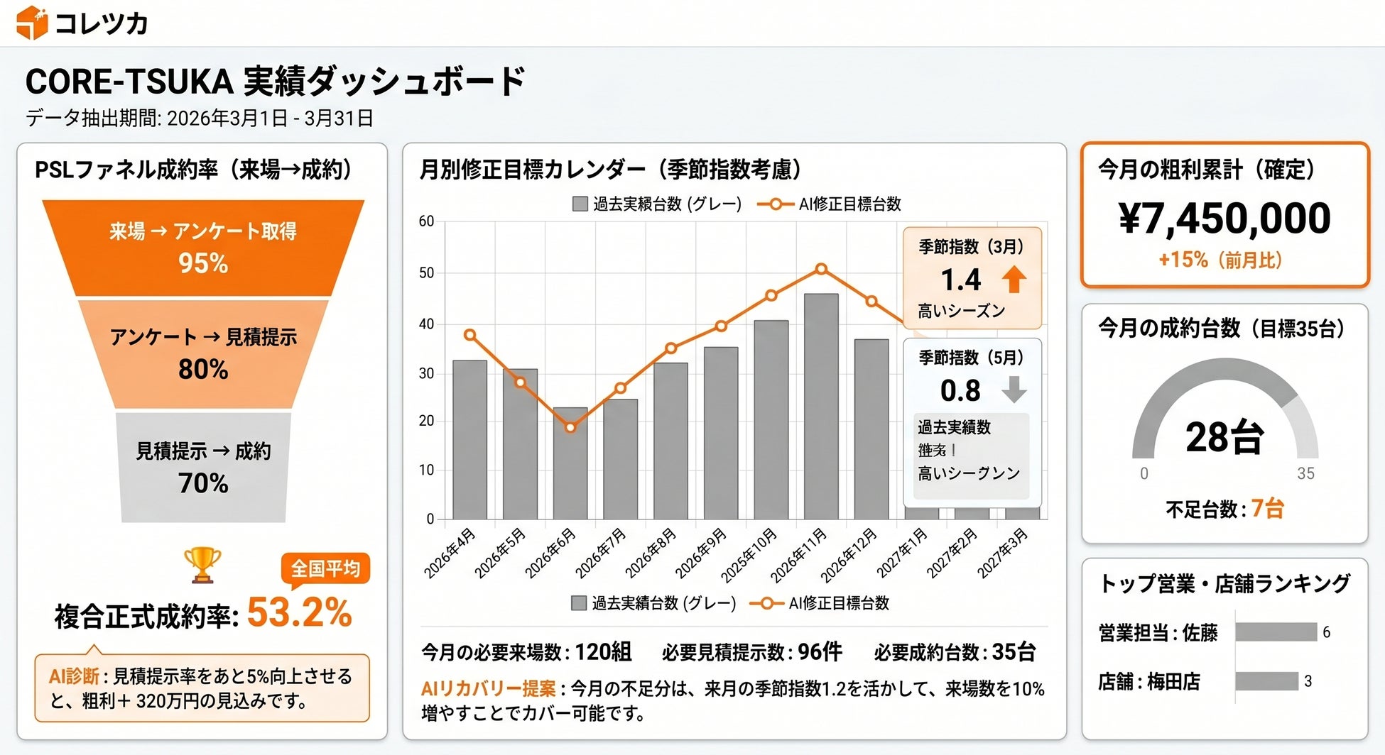 来店100組のうち53組が成約する——これがPSLが導く全国平均の構造です。コレツカはこの構造を可視化し、「どこに・いくらの機会損失があるか」を金額換算でAIが自動診断します。