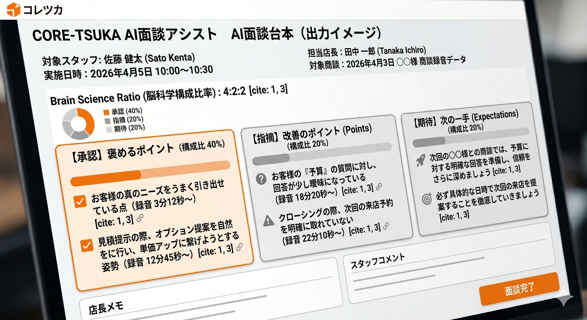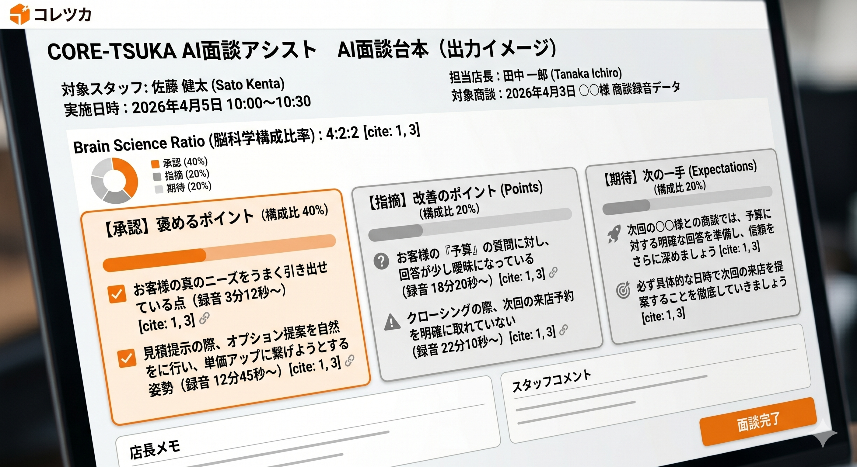 AIが商談データから「褒める点・改善点・次の一手」を自動生成。面談構成は脳科学の知見に基づく「承認4:指摘2:期待2」の比率設計を採用し、新人店長でも即日から高品質な1on1面談が実施できます。店長のスキルに依存しない育成を実現します。