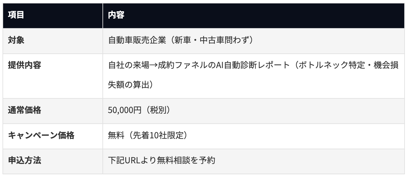 また、ローンチを記念し、先着10社限定で「無料PSLファネル診断」(通常5万円相当)を提供いたします。自社の来場数・アンケート数・見積数・成約数をご提供いただくだけで、AIがボトルネックと機会損失額を自動算出し、診断レポートをお届けします。