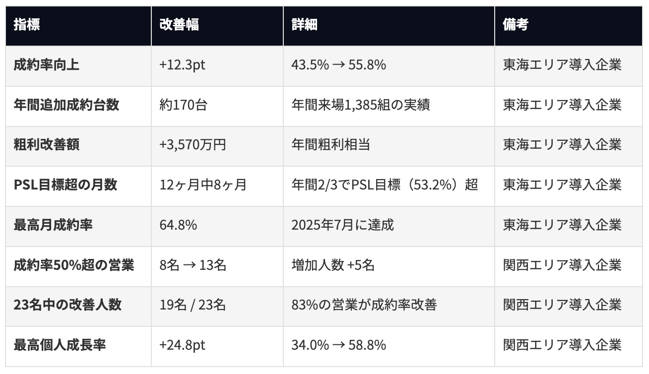 すでに導入企業において成約率43.5%→55.8%(+12.3ポイント改善)、年間粗利換算で約3,570万円相当の収益向上効果が確認されています。