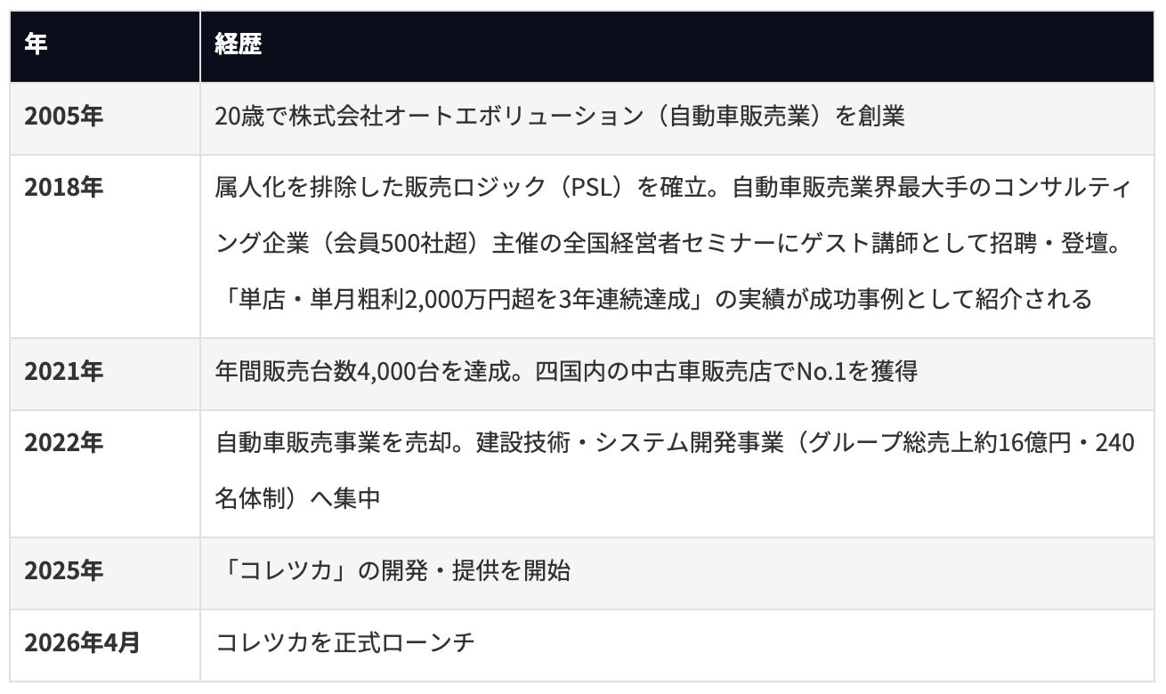 コレツカは、20歳で中古車販売店を起業し、四国内No.1(年間4,000台)に育て上げた青野聡太代表が、自らの現場経験とノウハウを徹底的に言語化・科学化することで生み出したサービスです。