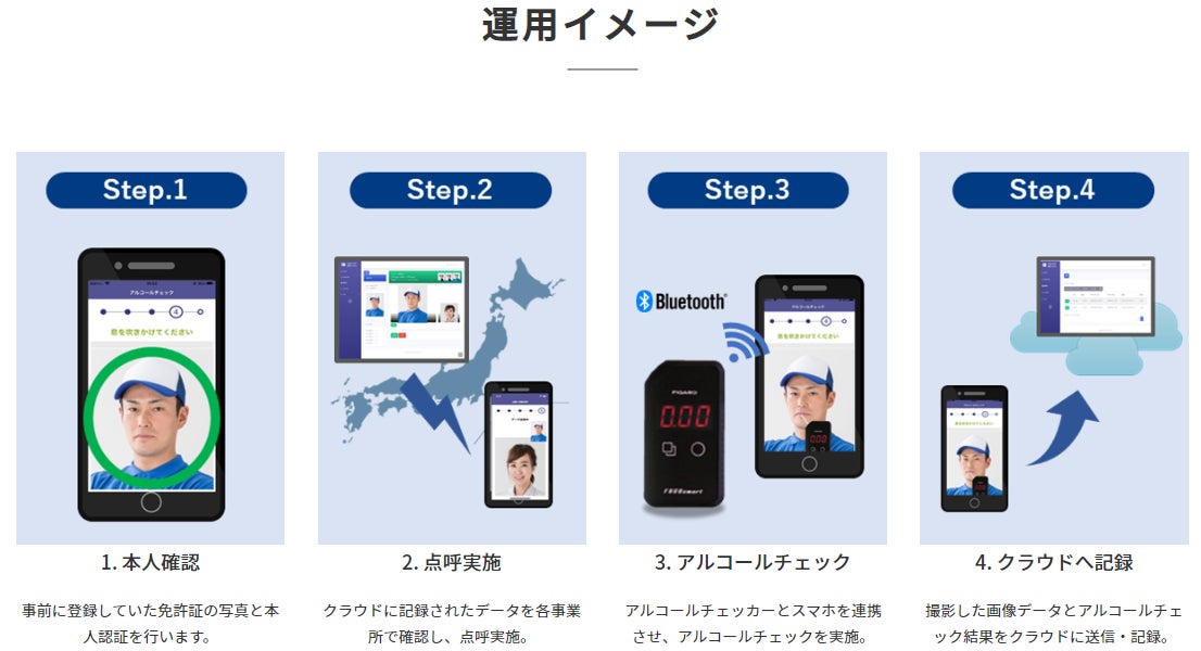 対面点呼・IT点呼はスマホ・タブレット端末を介して、アルコールチェッカーの機器認証と本人確認のための顔認証を行います。ログイン時の入力の手間が省け、なりすましなどの不正な点呼を防ぎます。