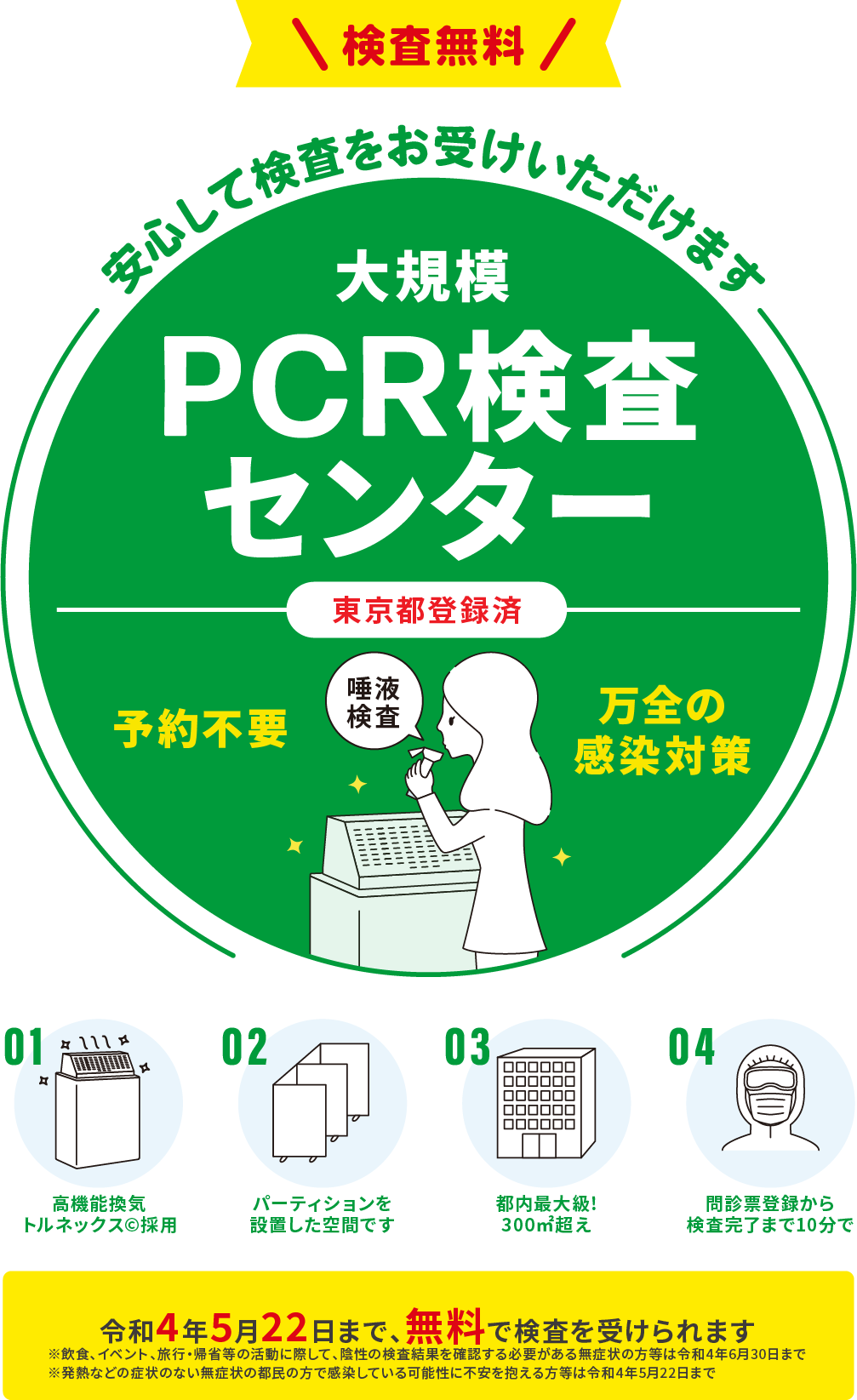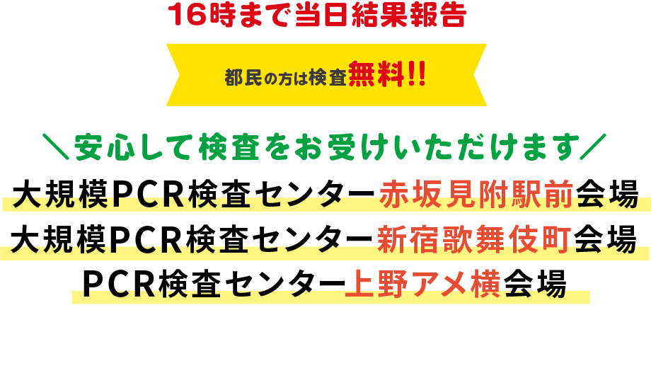 赤坂・新宿歌舞伎町と同様、16時までの検体提出で当日検査結果報告保証。追加料金なし。ゴールデンウィークも休まず運営しております。