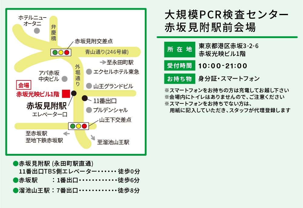 赤坂見附駅前会場:東京都港区赤坂3丁目2−6 赤坂光映ビル1階・B1階 受付時間:10時ー21時