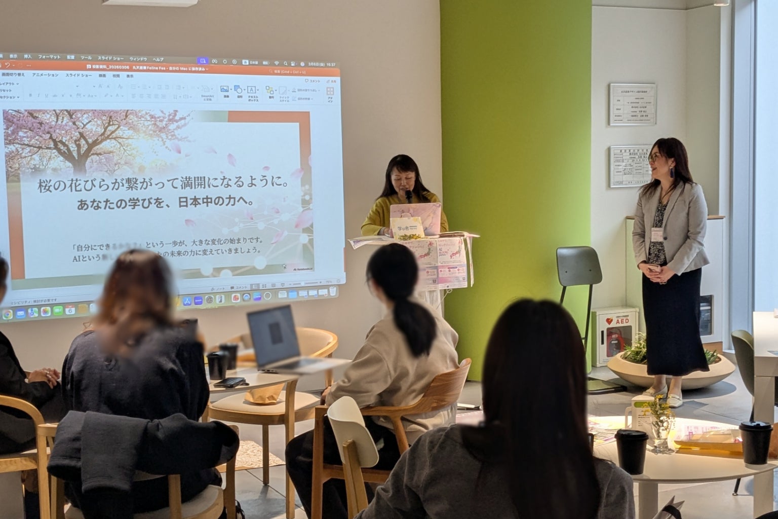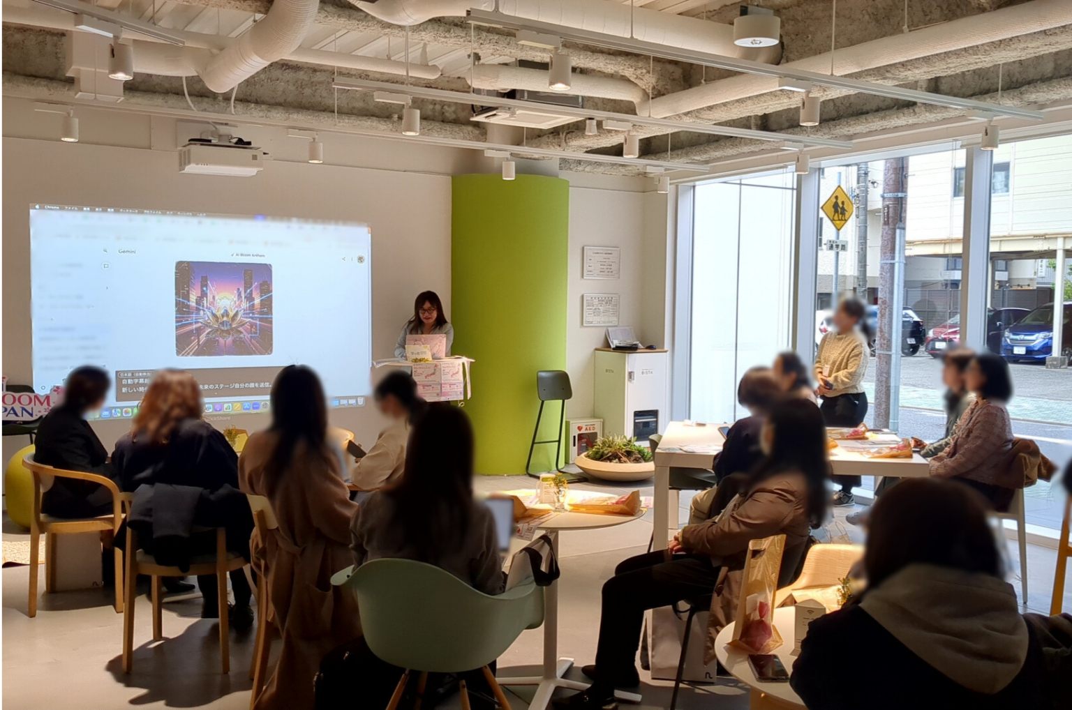 名古屋・栄の丸天産業株式会社本社にて開催された女性の多様な働き方や健康をテーマとしたイベント「Fellne FES 2026」内のセミナーとして、第1回のAIデモンストレーション講座を実施いたしました。セミナーは事前申込の段階で満席となり、当日は立ち見で参加される方もいらっしゃるなど、AIへの関心の高さを感じる時間となりました。