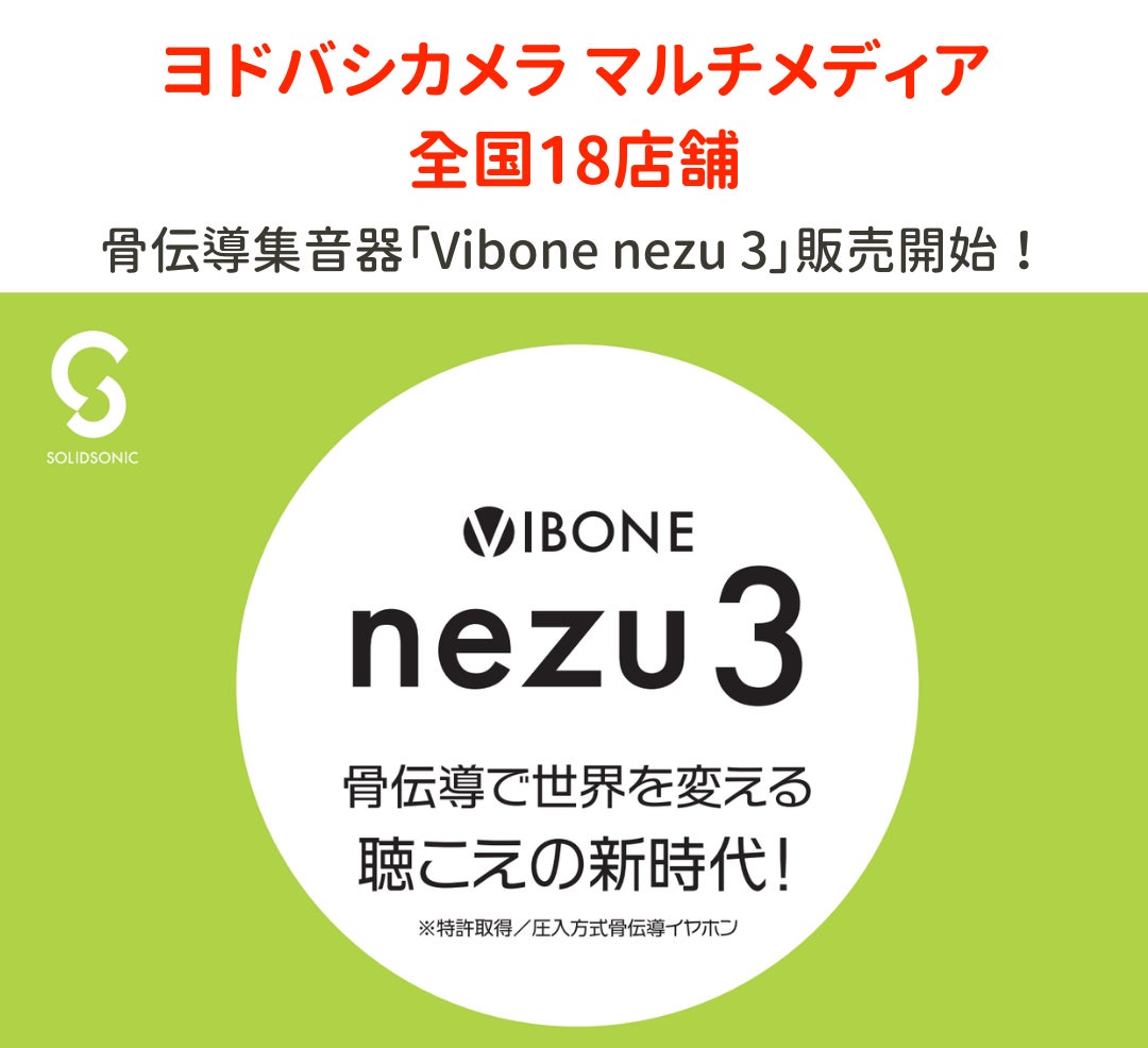 ソリッドソニック株式会社(本社:兵庫県神戸市・代表取締役:久保貴弘)は、ヨドバシカメラ マルチメディア全国18店舗にて、骨伝導集音器「Vibone nezu 3」の一般販売を開始いたしました。