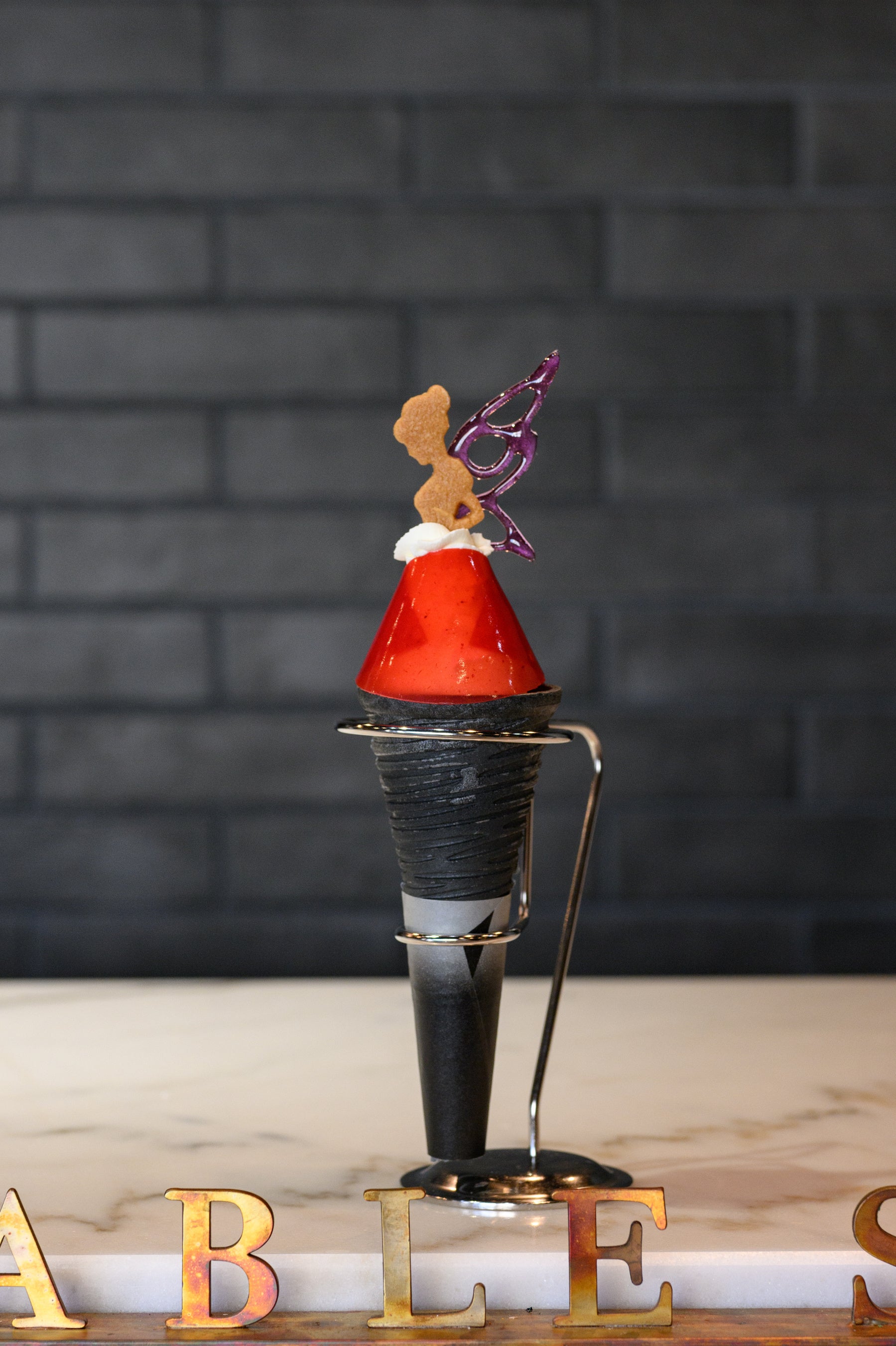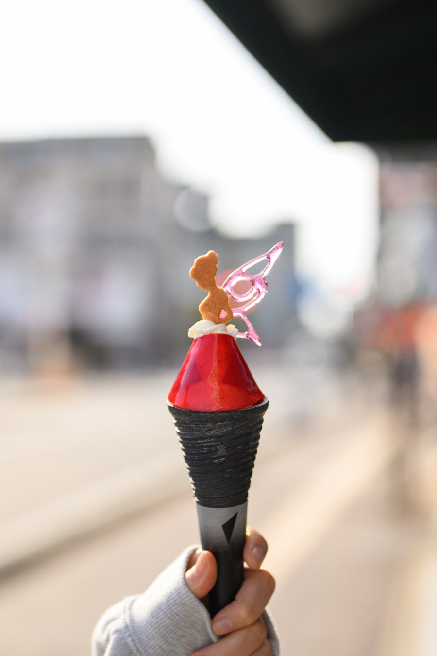 黒いコーンは黒壁スクエアをイメージしており、竹炭で作られているんだとか。中には爽やかなミルク風味のソフトクリームがギュッと詰まっていて、可愛い妖精の形をしたクッキーや、フランボワーズの寒天でできた赤いドレスがアクセントに