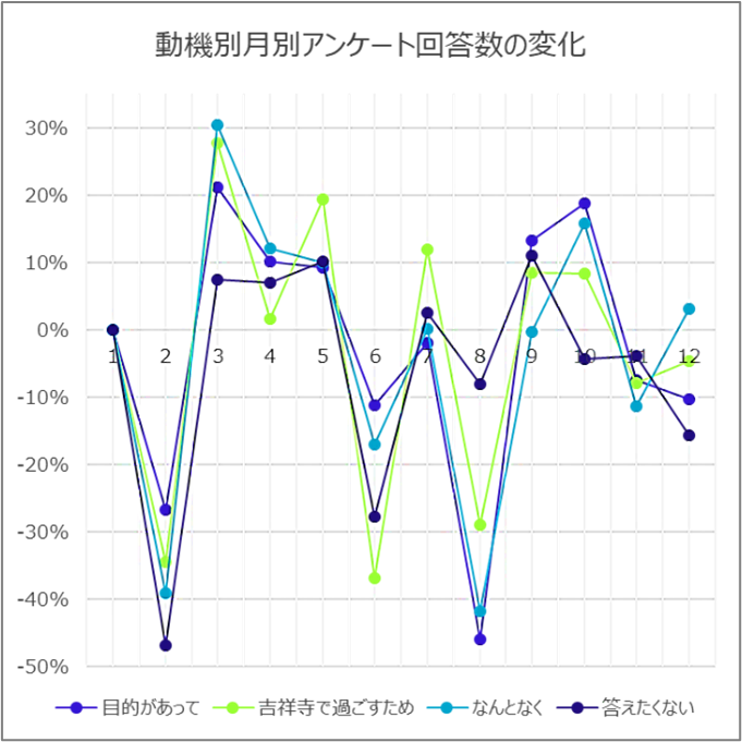 回答数の変化については、概ね1か月ごとに増減していることが見受けられた。また、減少した月の翌月の増加率が減少率に比べ、その幅が小さいことから、目的意識をもった来街者の割合が頭打ち状態であり、その来街者の来街が概ね1か月間隔になっているのではないかと推測できます。