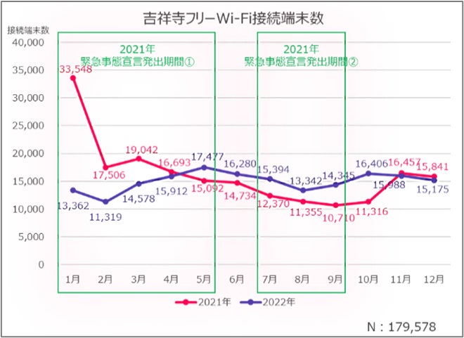 「吉祥寺来街動機等調査2022」を2022年1月1日(日)から2022年12月31日(土)の間に吉祥寺フリーWi-Fiを利用した179,578端末を対象に実施。調査の結果、新型コロナウイルス感染症を踏まえた来街傾向と街のリアルな来街状況やその動機などが見えてきました。