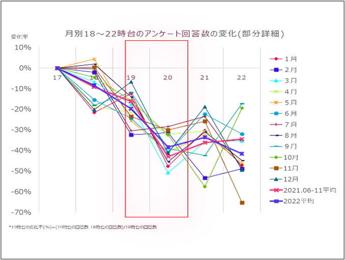 2021年6~11月平均と比較し、18時台までの変化率に大きな変化はないが、19時台の変化率が広がっている。来街者の帰宅時間が2021年に比べ早めに吉祥寺を離れる来街者が増えているのではないかと考えられます。