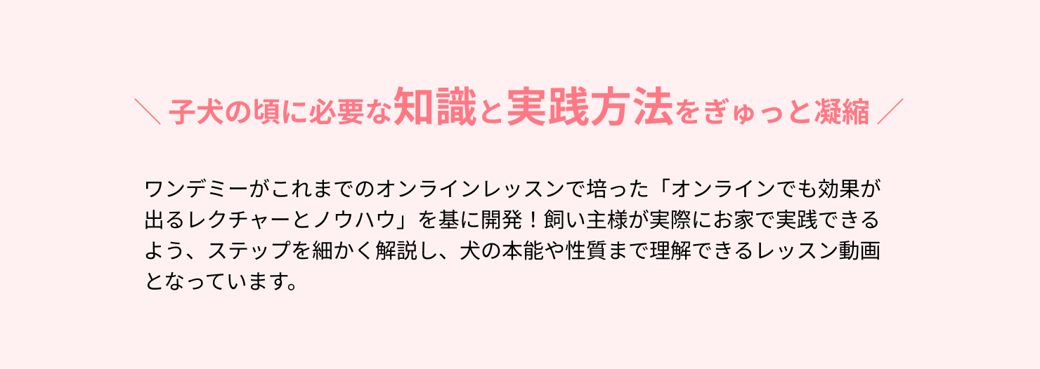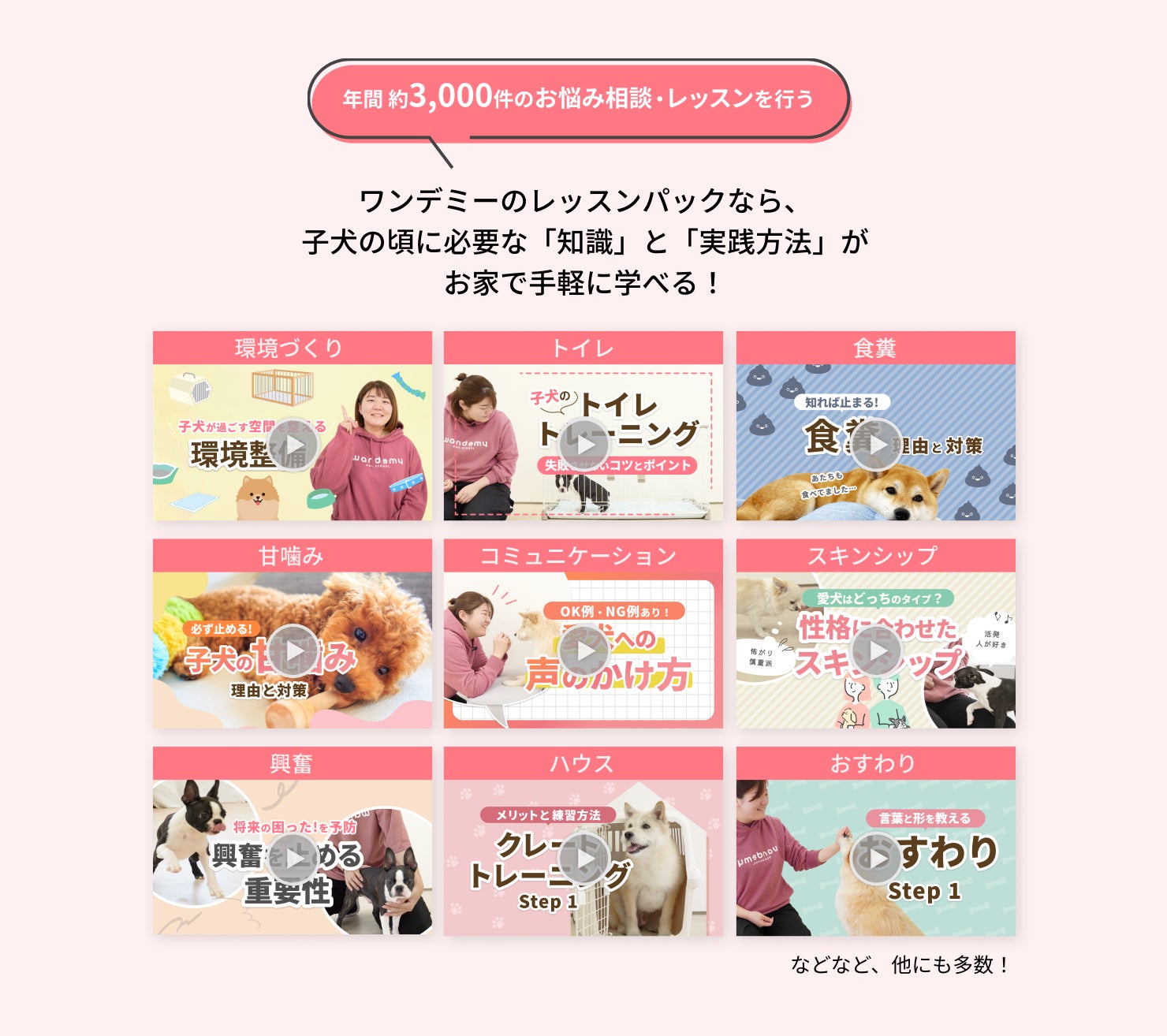 本レッスンパックは、ワンデミーが独自に開発した「子犬のためのレッスン動画」パッケージです。