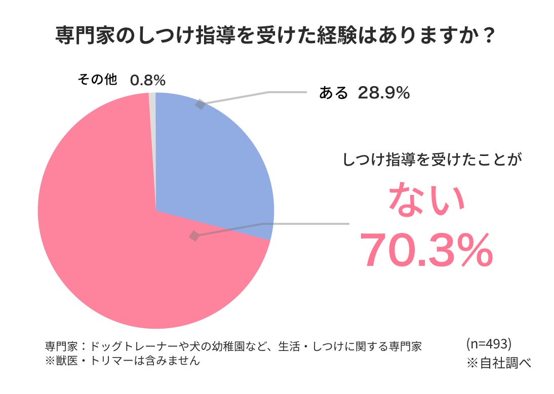 犬を迎えた飼い主の96.4%が愛犬の悩みを抱えている一方で、ドッグトレーナーなどの犬の専門家によるしつけ指導を受けた経験がある人は3割に満たない状況です。