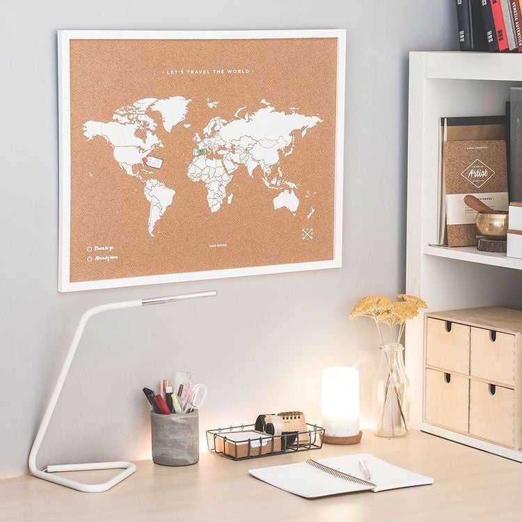『コルクマップ』はスペイン第2の都市・バルセロナで製作しているナチュラルインテリアです。使われているのは天然コルクにホワイトの世界地図が描かれたボードとホワイトの木製フレームだけというモノトーンのシンプル仕立て。コルクが持つ木の温もりが感じられ、明るい色彩とモダンな雰囲気が部屋の空間づくりをお洒落に演出してくれます。