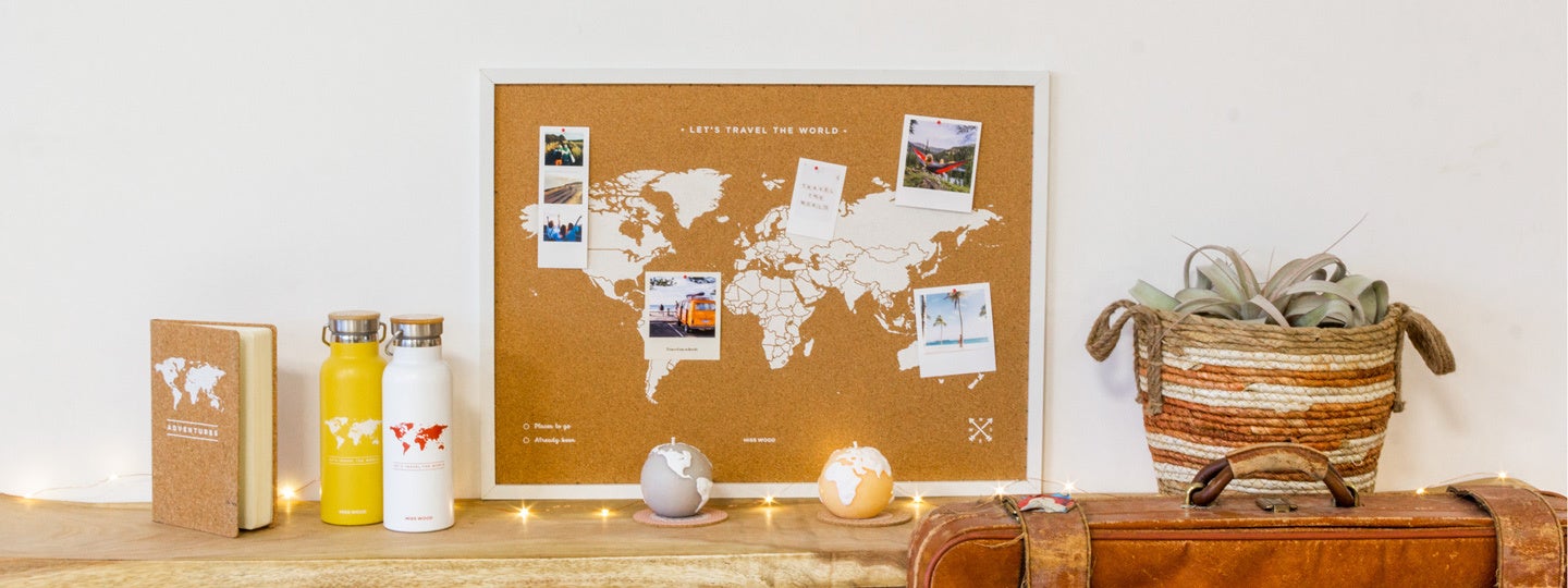 眺めるだけで旅へのロマンが掻き立てられる大型の世界地図が描かれたナチュラルインテリアとしての『コルクマップ』。温もりが感じられるコルクシートに描かれているので、旅の思い出の写真や行きたい場所をピン留めでき、あなただけのオリジナルのインテリアにアレンジできます。