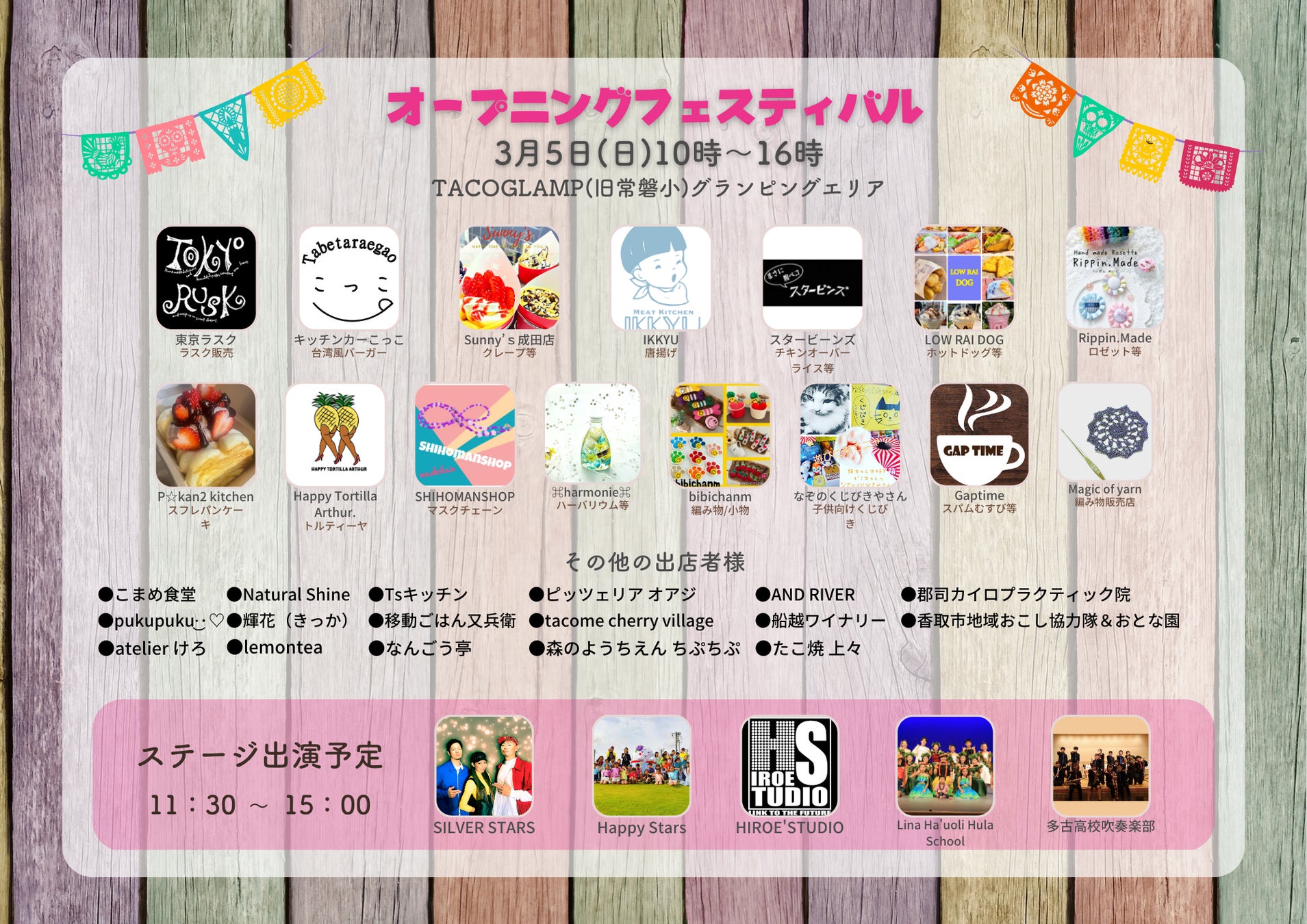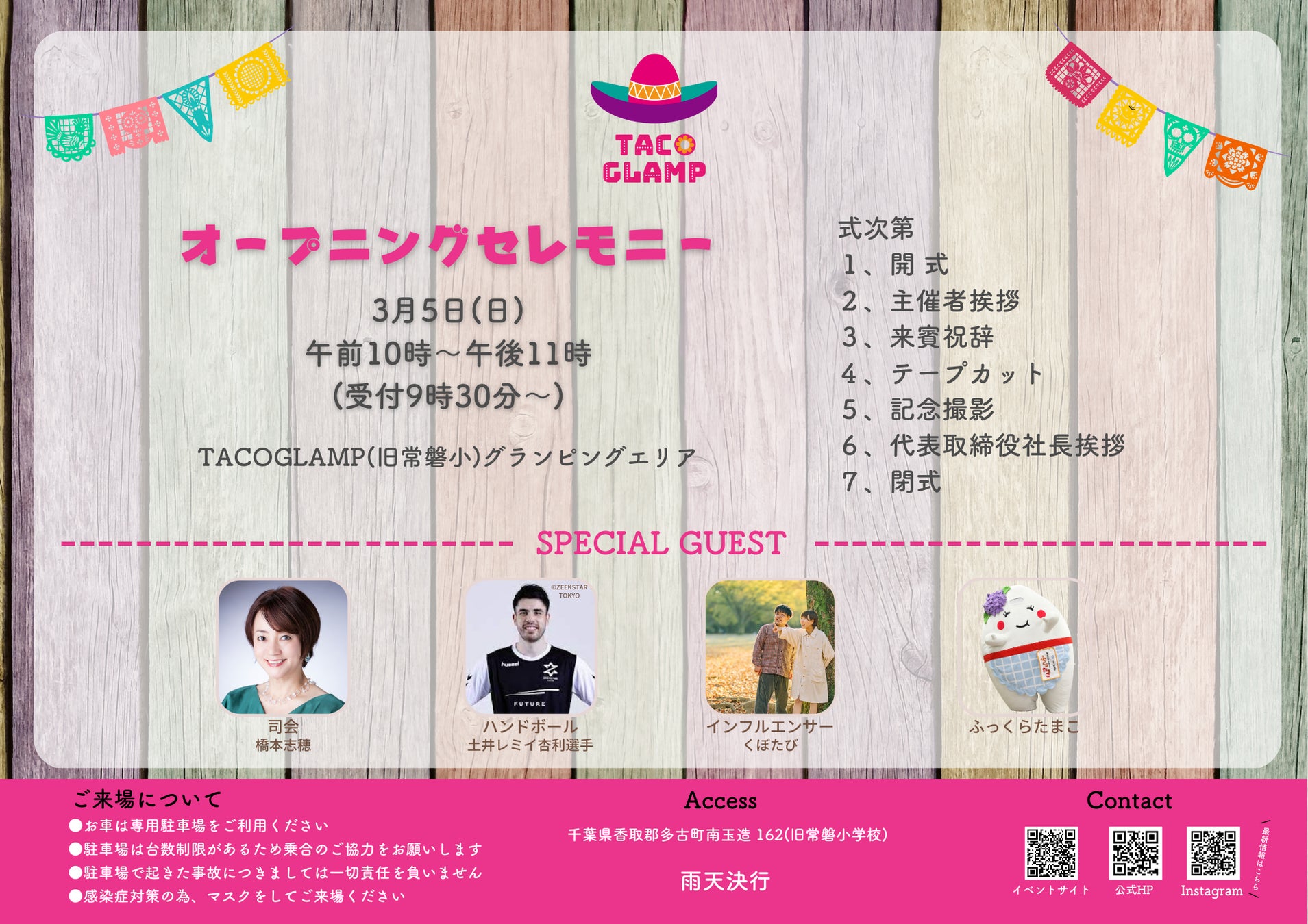 この度、新しい挑戦として、千葉県香取郡多古町の廃校(旧常磐小学校)をリノベーションし、千葉県最大級のリゾート施設「TACO GLAMP THE MEXICO」をオープンいたします。開業を記念して地域コミュニティと共につくり上げるオープニングイベントを2023年3月5日(日)に開催いたします。