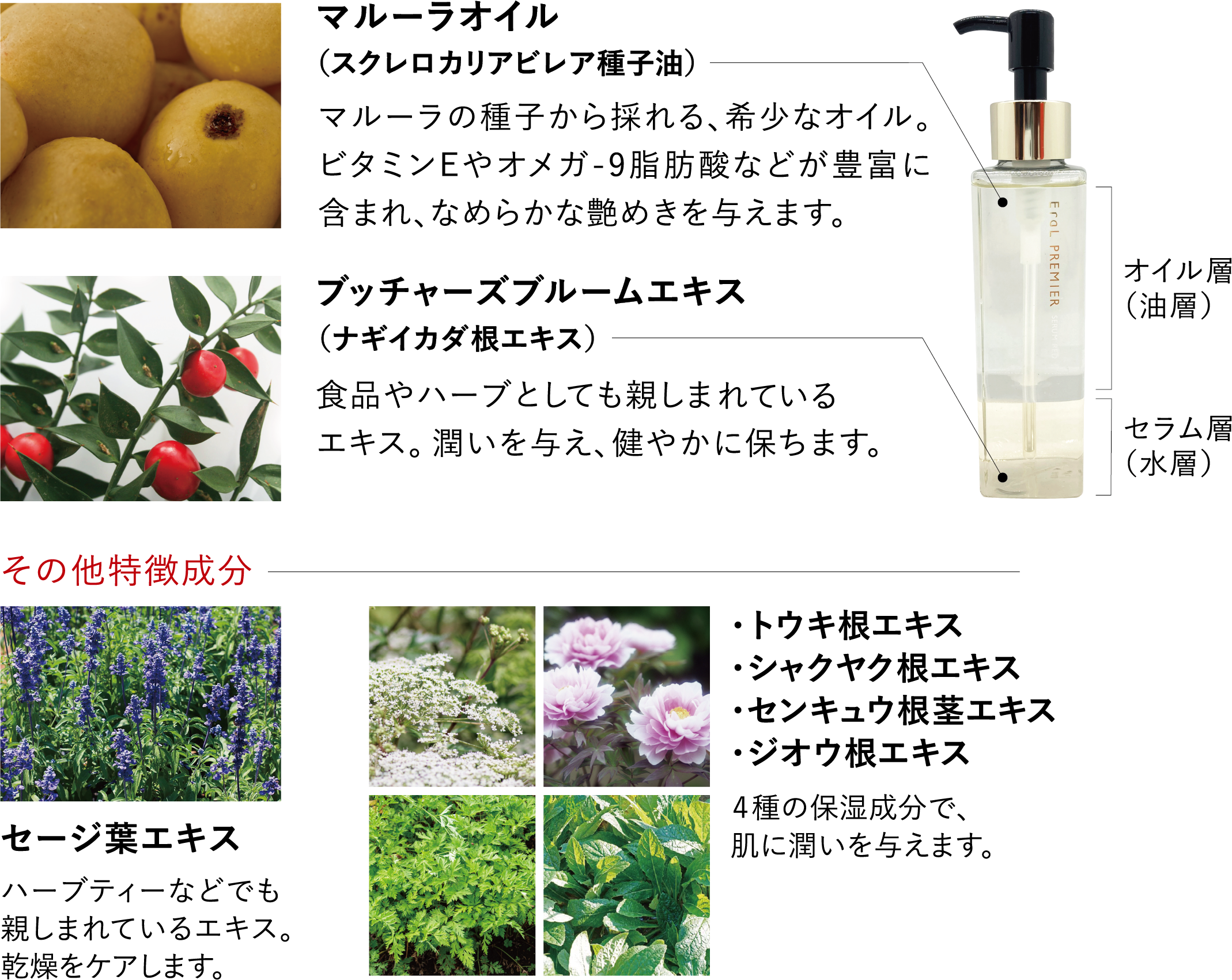 オイル層、セラム層の2層にたっぷりの美容成分を配合し、様々な悩みにアプローチします。