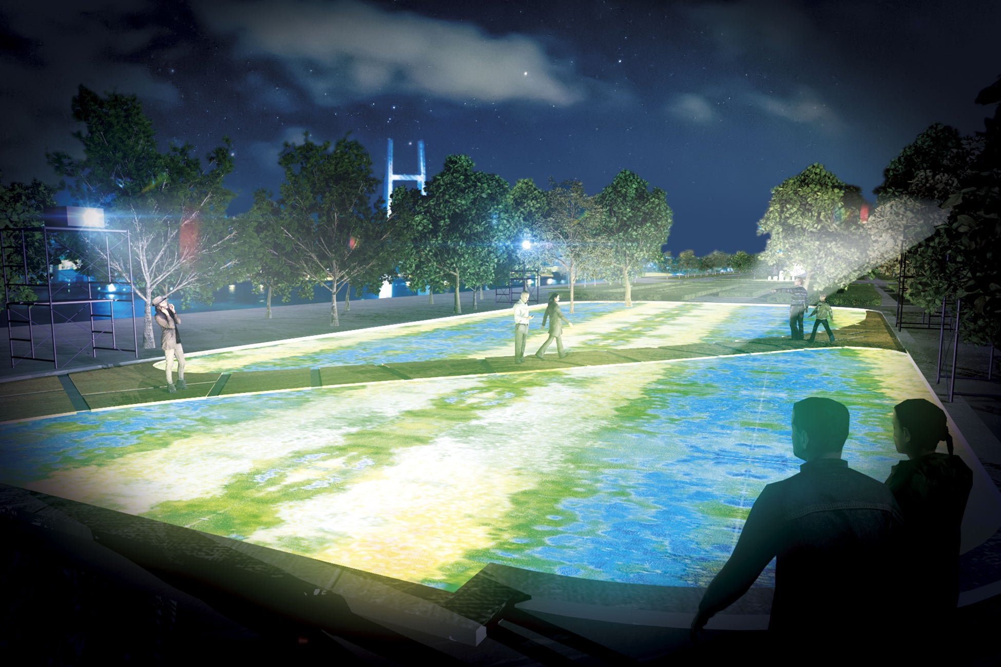 人の動きに反応して映像が変化するプロジェクションを実施します。