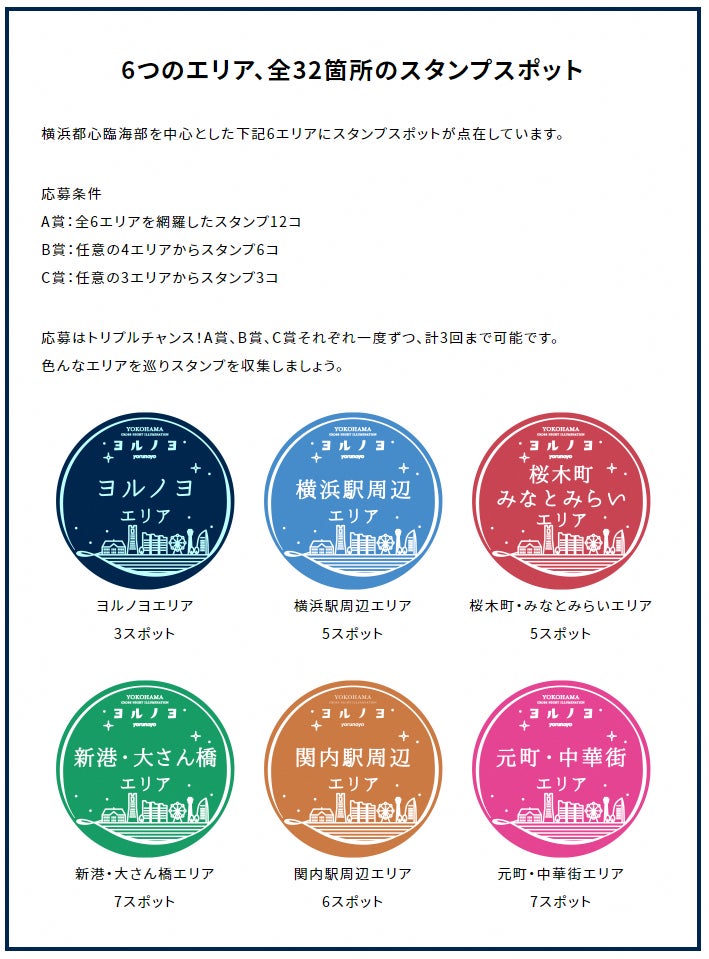 ヨルノヨの会場及び横浜都心臨海部のイルミネーションがスタンプのスポットとなっており、全部で6エリアに分かれています。