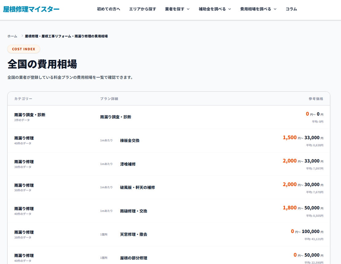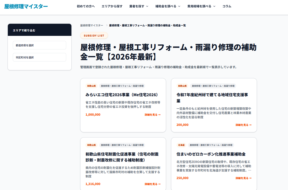 一般の方が屋根修理の正しい知識を付けるためのコンテンツとして、工事別の費用相場や、各自治体で使える補助金の情報を網羅しています。