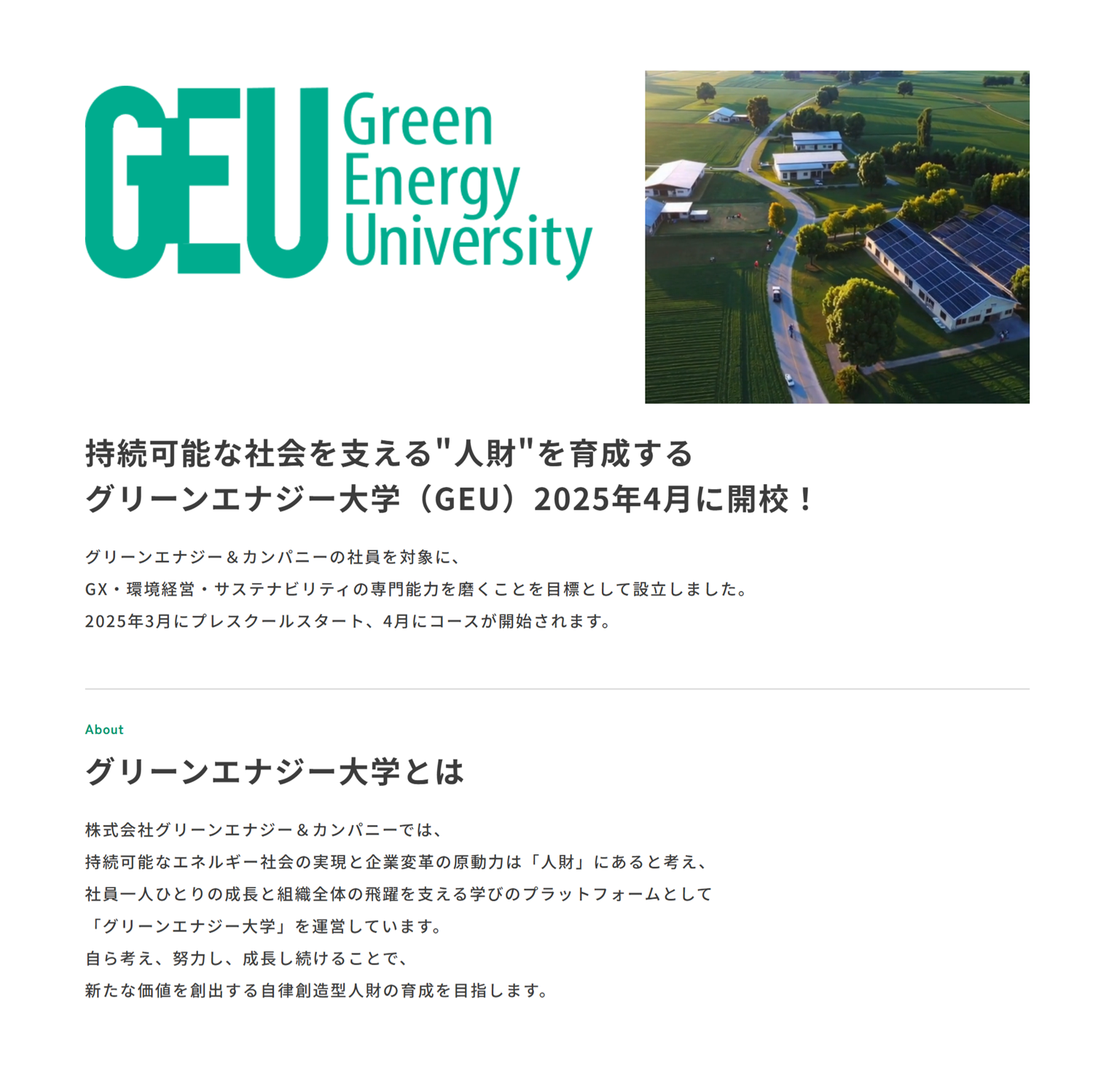 株式会社グリーンエナジー&カンパニー(東京証券取引所グロース(証券コード:1436)、本社:東京都港区、代表取締役社長:鈴江崇文。以下「当社」)は、当社の社員を対象に、GX・環境経営・サステナビリティの専門能力を磨くことを目標として「グリーンエナジー大学」を開校。2025年3月にプレスクールスタート、4月にコース(カリキュラム)を開始します。