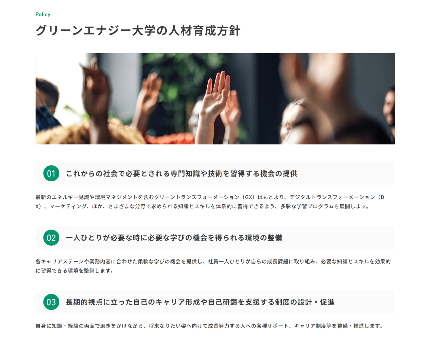 株式会社グリーンエナジー&カンパニーでは、持続可能なエネルギー社会の実現と企業変革の原動力は「人財」にあると考え、社員一人ひとりの成長と組織全体の飛躍を支える学びのプラットフォームとして「グリーンエナジー大学」を運営しています。自ら考え、努力し、成長し続けることで、新たな価値を創出する自律創造型人財の育成を目指します。