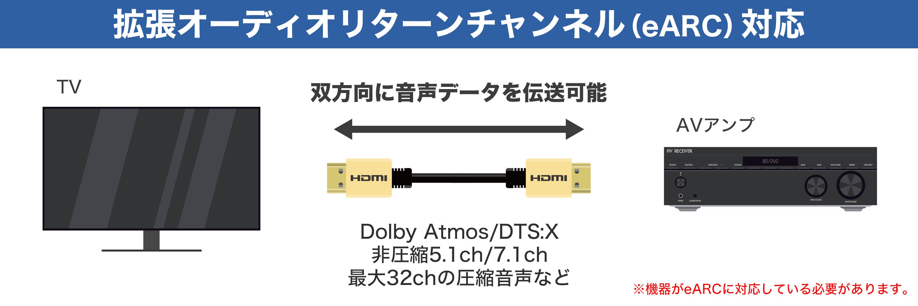 eARCは非圧縮の5.1ch、7.1ch、あるいは最大32chからなる、オブジェクトベースオーディオなどの最新のオーディオに対応しております。