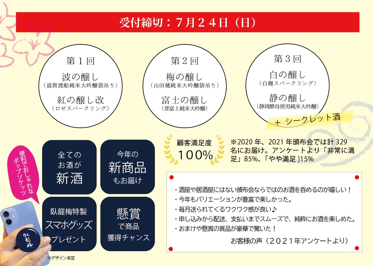 静岡市清水区の清酒・臥龍梅醸造元三和酒造株式会社(本社:静岡県静岡市清水区、代表取締役社長:鈴木 克昌)は、臥龍梅公式オンラインストアにて、「臥龍梅 限定頒布会 2022」の申込受付を数量限定で開始いたしました。