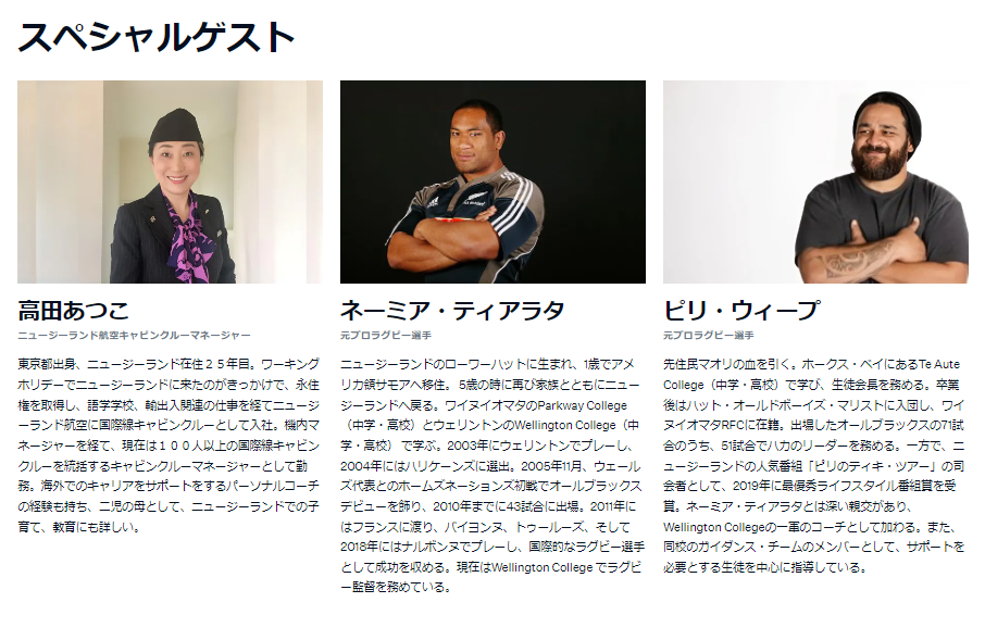 また、ニュージーランドへの留学を目指す小中高生・大学生や保護者のために、「ニュージーランド留学最新情報セミナー」やスペシャルゲストによるセミナーも開催。「元オールブラックス選手2名と考えるニュージーランド留学の魅力」や 「ニュージーランド航空キャビンクルーマネージャーに聞く、ニュージーランドの生活、キャリア、文化」ではよりリアルな留学体験談やNZの魅力についてお伝えいたします。
