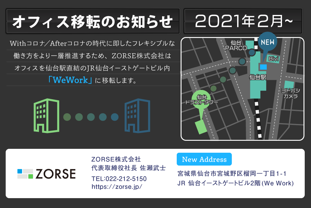【東北のベンチャー企業】ZORSE、仙台駅直結『JR仙台イーストゲートビル(WeWork)』へオフィス移転のご案内