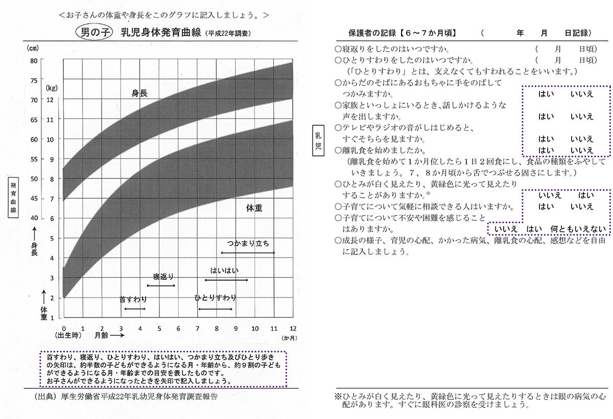 また、母子手帳の月齢ごとに記入していく「成長の記録」。その質問のほとんどに、リトルベビーのご家族は「いいえ」と答えることになります。(一般的な母子手帳の例)