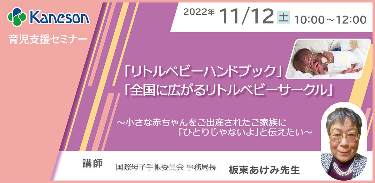 カネソン株式会社(本社:大阪市都島区、代表取締役社長:柳瀬喜和)は、低体重で生まれた小さな赤ちゃんのための母子手帳のサブブックである「リトルベビーハンドブック」の必要性と、小さな赤ちゃんを出産し戸惑いと不安を抱えるご家族へ、「全国に広がるリトルベビーサークル」を知ってもらうための無料セミナーを開催します。