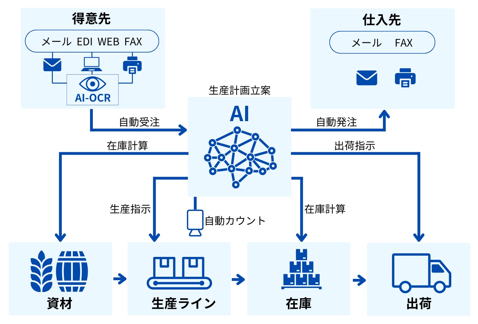 AIカメラやAI-OCR、計画立案AIにより、入力、計画、指示、受発注業務を自動化し、現場の負担を減らしながらムダのない仕組化された生産体制に導きます。