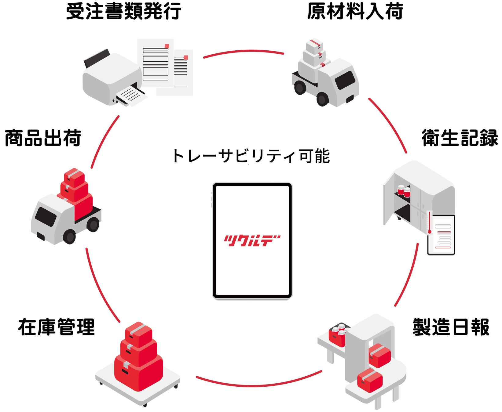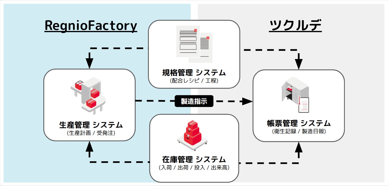 RegnioFactoryの優れた生産管理システムと、ツクルデの実績ある帳票管理システムを強力に連携。規格管理システムと在庫管理システムを介して、製造現場の業務効率を飛躍的に向上させます。