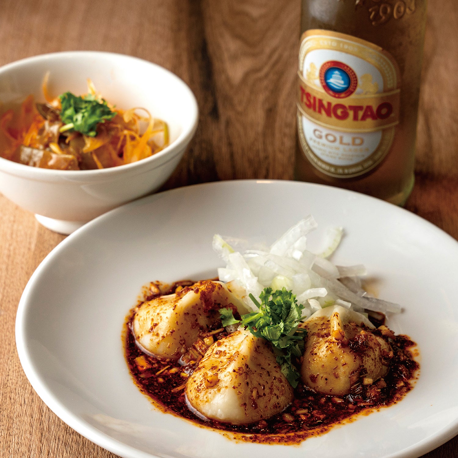 【シビレヌードルズ 蝋燭屋】肉汁たっぷり水餃子とピリ辛葱ザーサイ、青島プレミアムビール(1,500円)