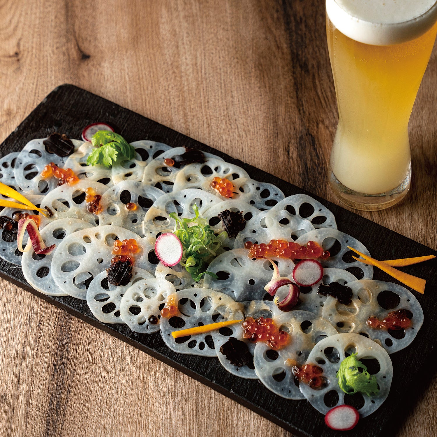 【やさい家めい】生絞り生姜のシャンディガフとレンコンのカルパッチョ(2,000円)