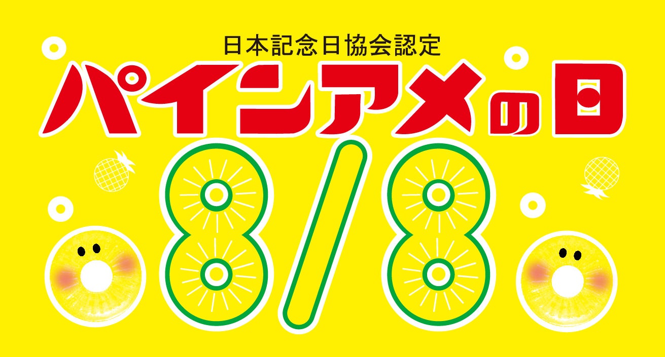 「パインアメ」の美味しさをさらに多くの人に知ってもらうことを目的とし、パイナップルが夏の果物であること、輪切りのパイナップルをモチーフにしていることから、輪(◎)の形が4つそろう8月8日を「パインアメの日」とし、2015 年に日本記念日協会に登録されました。