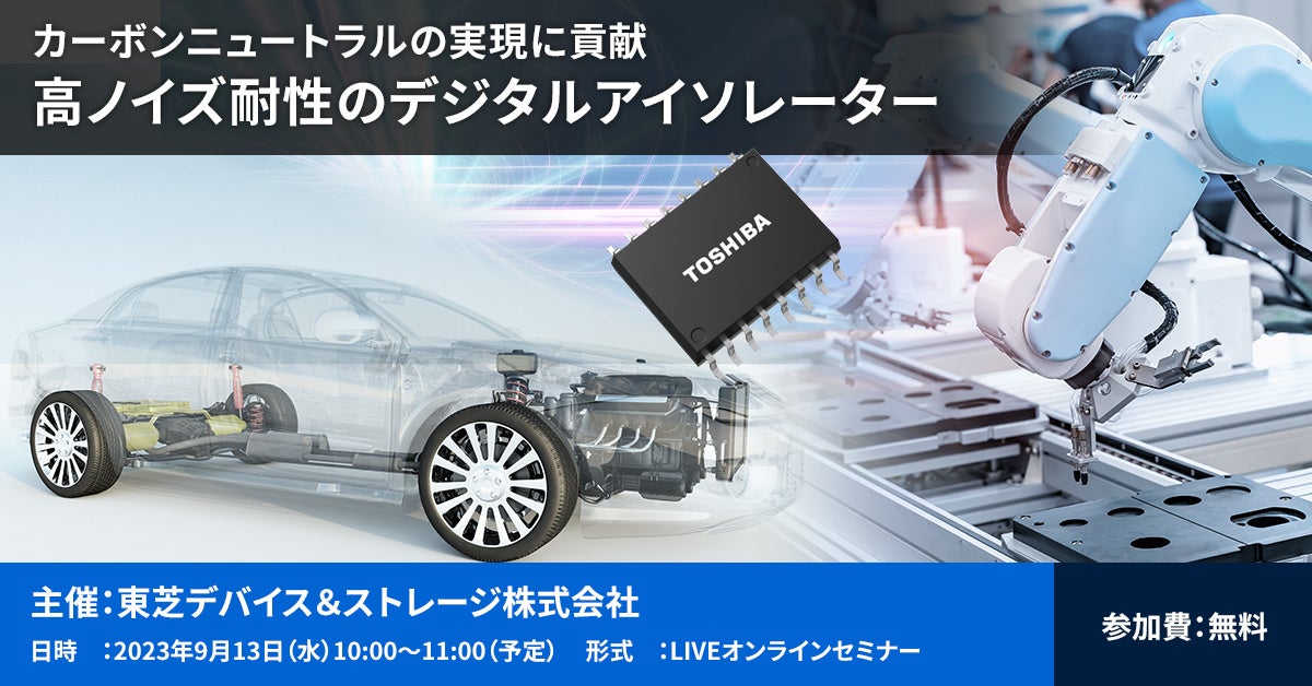 東芝デバイス&ストレージ株式会社(本社:神奈川県川崎市、 代表取締役社長:佐藤 裕之)は、来る9月13日(水)に、東芝Webセミナー「カーボンニュートラルの実現に貢献 高ノイズ耐性のデジタルアイソレーター」 と題し、無料Webセミナー(ウェビナー)を開催します。