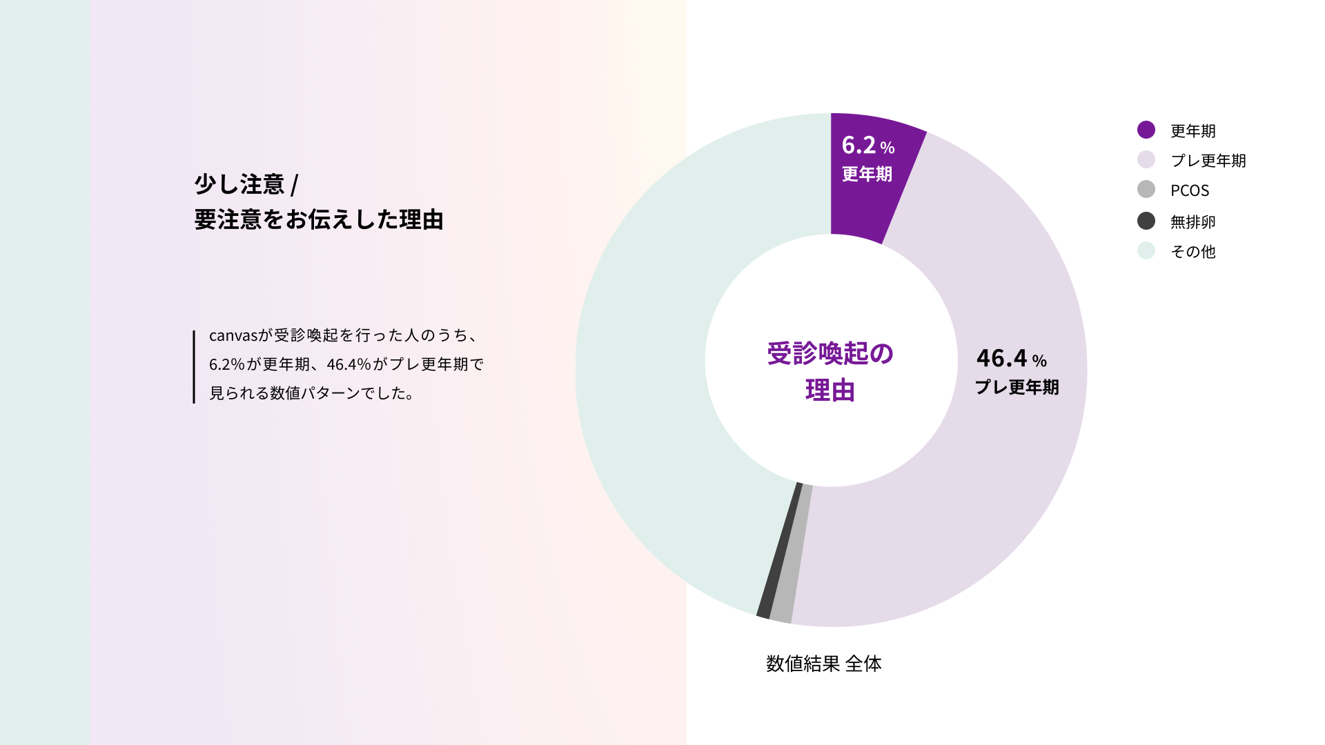 そこで、更年期に差し掛かりつつある方々の状態をよりよく理解し、実際に困っている女性の助けになるため、また更なる医学的発展に貢献するため、私たちはcanvasの検査を受けた方のデータをレポートとして発表することにいたしました。