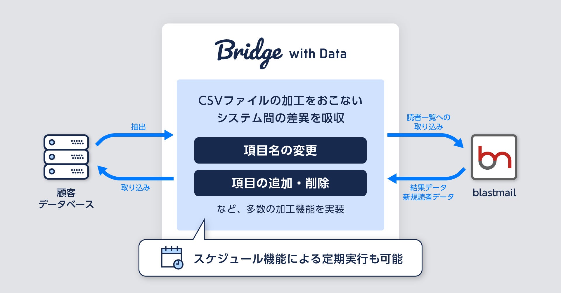 「blastmail」をご利用の事業者様は、「blastmail」とその他クラウドサービス等とのデータ連携業務の効率化を「Bridge with Data」により実現できます。これまでは、他のクラウドサービス等からエクスポートしたCSVファイルを「blastmail」へ取り込む際には、項目名の編集や必要項目の追加、不要な項目の削除などの編集が必要でした。「Bridge with Data」をご活用いただくことで、このような編集作業を自動化することができます。