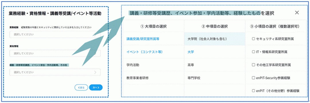 これまでのVisuMeスキル診断の評価項目は、“業務の実務経験”と“保有している資格”を軸にしてるため、業務経験が無い学生については能力の可視化に限界がありました。先般リリースした「講義等受講」や「イベント参加」、「日々の学内活動」などの診断評価項目の追加(※1)により、業務経験が無い学生でもスキル診断が出来るようになり、学生自身は職の選択など将来のキャリアデザイン検討用や就活時の自己アピール資料として、また、学校等においては就職相談やカリキュラム検討の参考情報など活用の幅が広がります。