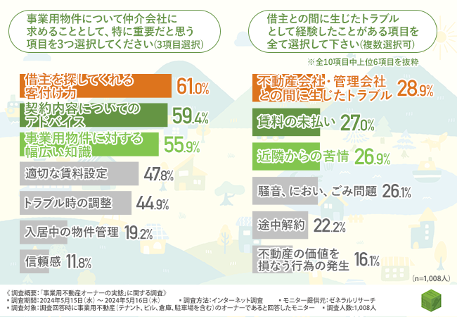 過去には、不動産会社や管理会社との間でのトラブルや賃料の未払いといったトラブルを経験した方もおり、事業用物件の仲介会社には借主を探してくれる客付け力や、契約内容のアドバイス、事業用物件に対する知識などを求めていることが明らかになりました。