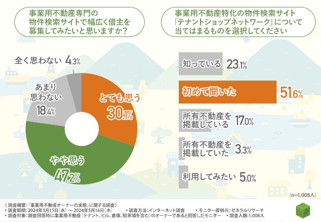 「事業用不動産特化の物件検索サイト「テナントショップネットワーク」について当てはまるものを選択してください」と質問したところ、『知っている(23.1%)』『初めて聞いた(51.6%)』『所有不動産を掲載している(17.0%)』『所有不動産を掲載していた(3.3%)』『利用してみたい(5.0%)』という回答結果になりました。