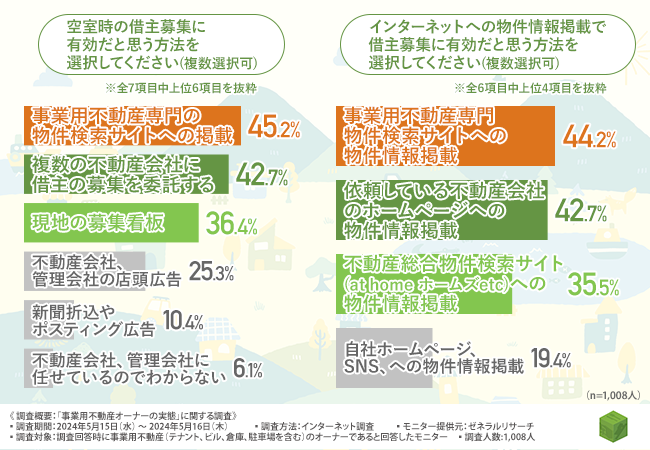そこで、「インターネットへの物件情報掲載で借主募集に有効だと思う方法を選択してください(複数選択可)」と質問したところ、『事業用不動産専門物件検索サイトへの物件情報掲載(44.2%)』と回答した方が最も多く、次いで『依頼している不動産会社のホームページへの物件情報掲載(42.7%)』『不動産総合物件検索サイトサイト(at home ホームズetc)への物件情報掲載(35.5%)』と続きました。