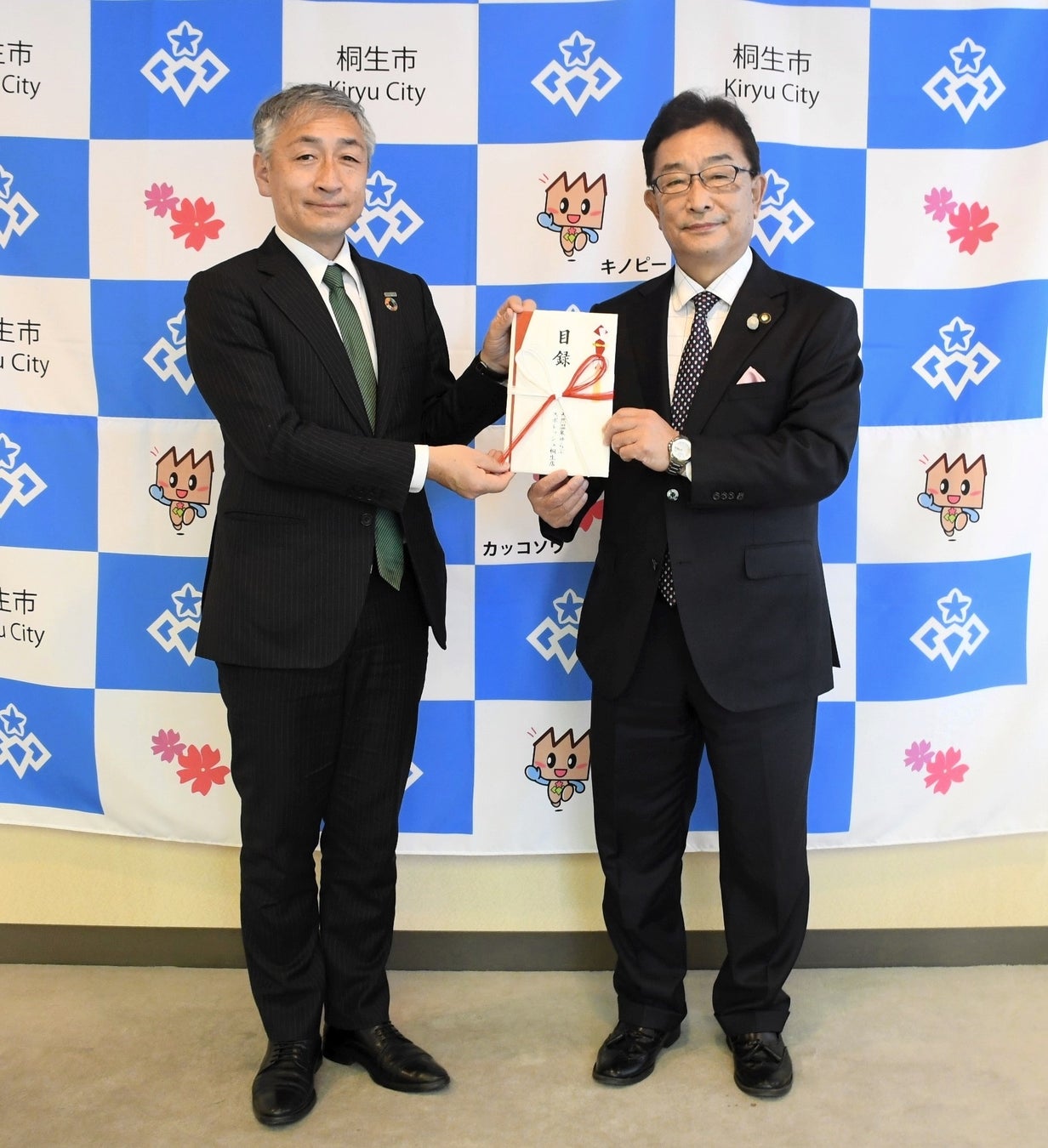 桐生市役所にて贈呈式(左側)レジャー事業本部の中村広文 本部長、(右側)荒木恵司 桐生市長